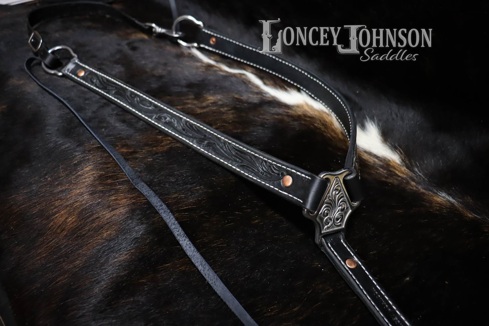 If you love black leather headstalls then we have the perfect breast collar for you! Made with tie strings, and Al Stohlman vintage hardware featuring a scroll style tooling pattern this breast collar is sure to become a treasured item in your tack room.
