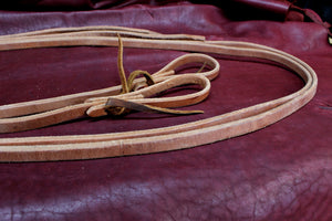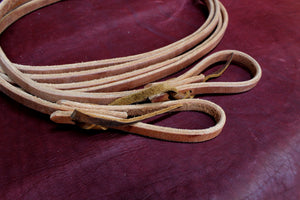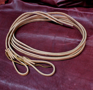 Harness leather slit reins from an unleavened hide making the ends weighted.