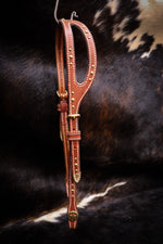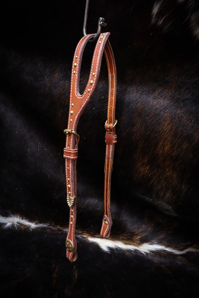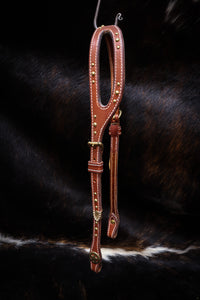 Expertly crafted for superior comfort and style, our Shaped Ear Bridle features high-quality English Bridle Leather and elegant brass hardware. The shaped ear design provides a secure fit, while the decorative dots and tips add a touch of sophistication. Experience the benefits of our expertly designed bridle for yourself.