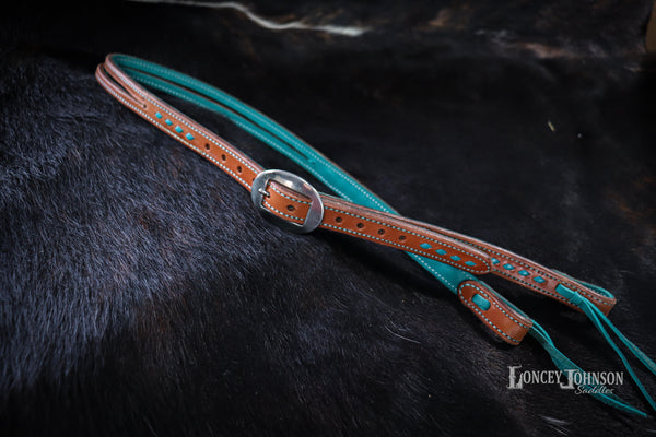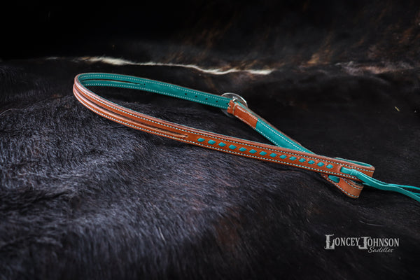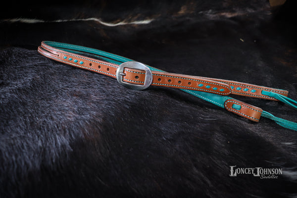 "Experience quality and beauty with our Split Ear Bridle, featuring a vibrant turquoise buck stitch and liner. This unique design adds a playful touch to any bridle, making it a must-have for any equestrian lover. Upgrade your riding experience with our Split Ear Bridle!"